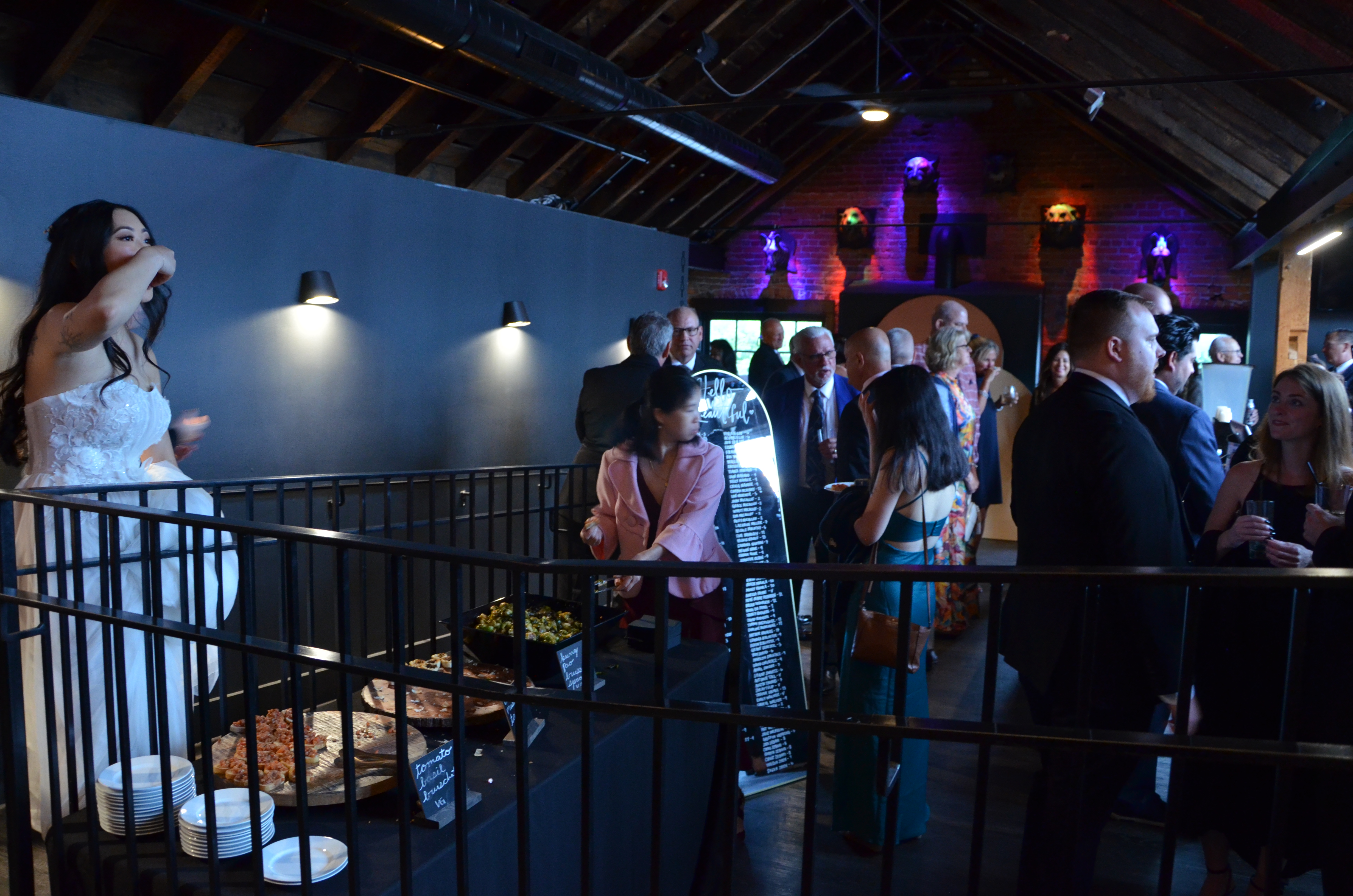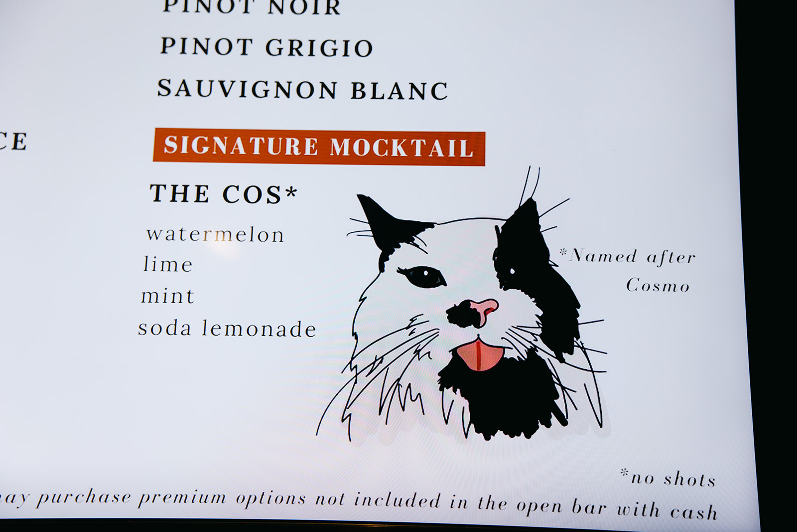 After the ceremony, the guests were invited to savor a delightful Cocktail Hour, where the Lounge and Roof Deck were transformed into a haven of joy and mingling. Amidst laughter and conversation, guests enjoyed a signature mocktail, aptly named after the couple’s beloved feline companion, whiskers and all. The couple opted for three delicious appetizers for their guests to snack on: Kung Pao Brussel Sprouts, Cheddar Mushroom Onion Tartlets, and a Tomato and Basil Bruschetta.