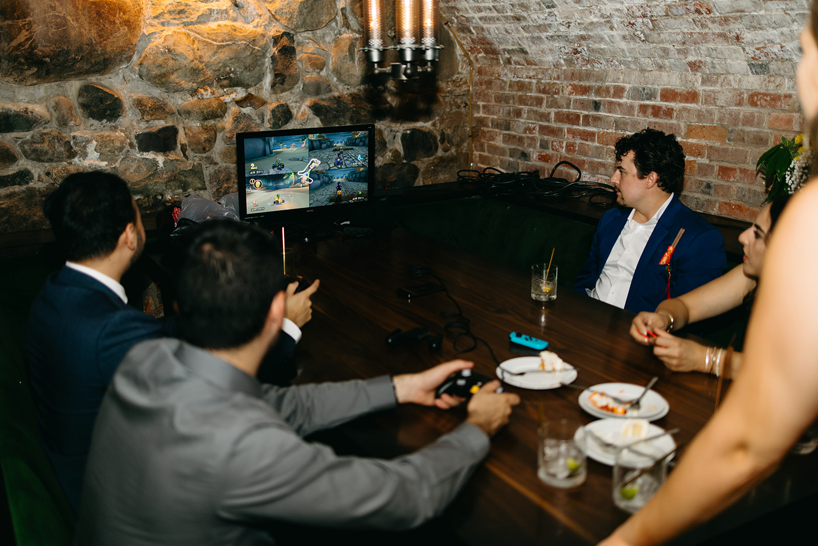 The epic wedding afterparty in Root was an unforgettable celebration that truly set the night on fire. The atmosphere was charged with excitement as guests revved up their competitive spirit with exhilarating rounds of Mario Kart, creating unforgettable memories and rivalries. As the beats from the talented DJ Kha Di Le from Complete Weddings Detroit reverberated through the venue, the dance floor came alive with joyful rhythms.