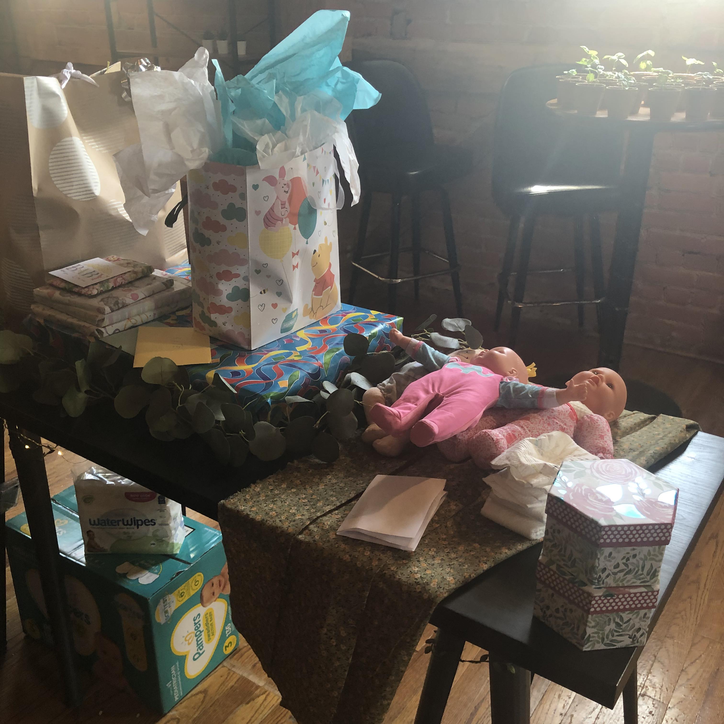 Next came the games. First, guests took turns passing two “presents” right and left based on the words in a cute baby story. One guest ended up with a box of dirt while the other received a baby sock monkey. Next, her friends and family took turns guessing how big her belly was by cutting strings to their guess length. Finally, there was a speed diaper changing round that left everyone laughing (no children were harmed). After a couple hours of greetings, gifts, and games, the mom-to-be sent guests home with a seedling basil plant that she grew herself. Needless to say, the shower was a wild success and still brings a smile to my face every time I think about it.