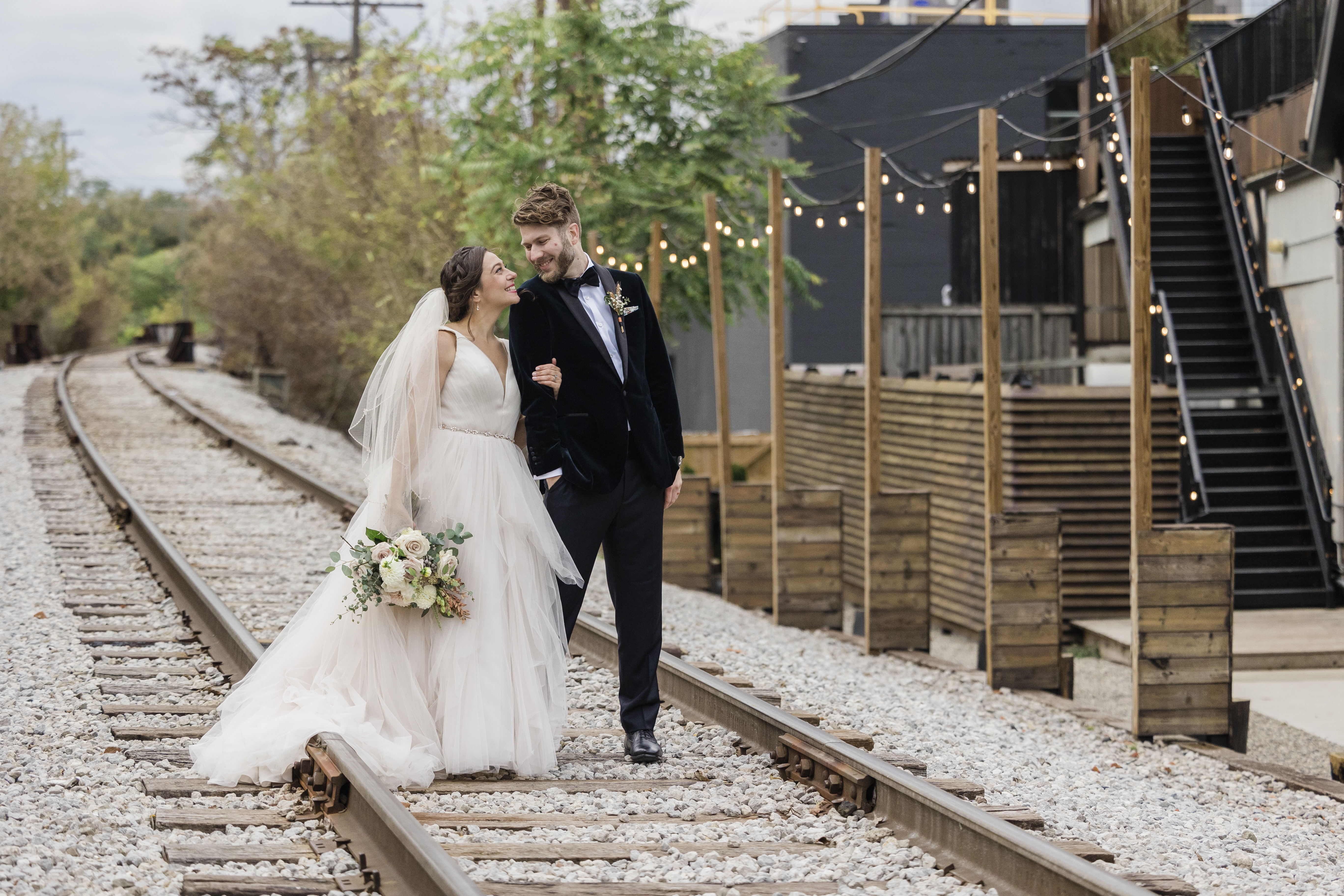 Their ceremony in the Mural Courtyard was a stunning affair, followed by a photo session on the railroad tracks during cocktail hour upstairs on the Lounge and Roof Deck.