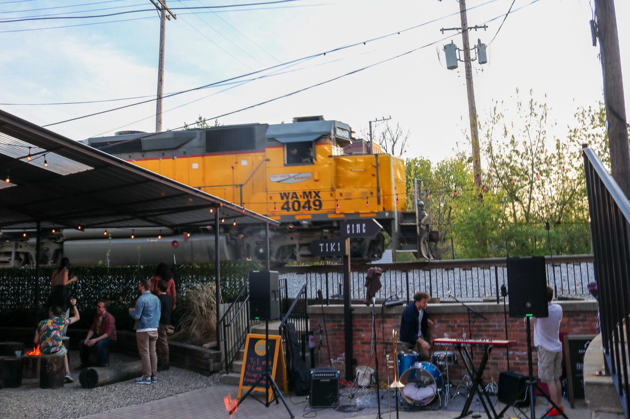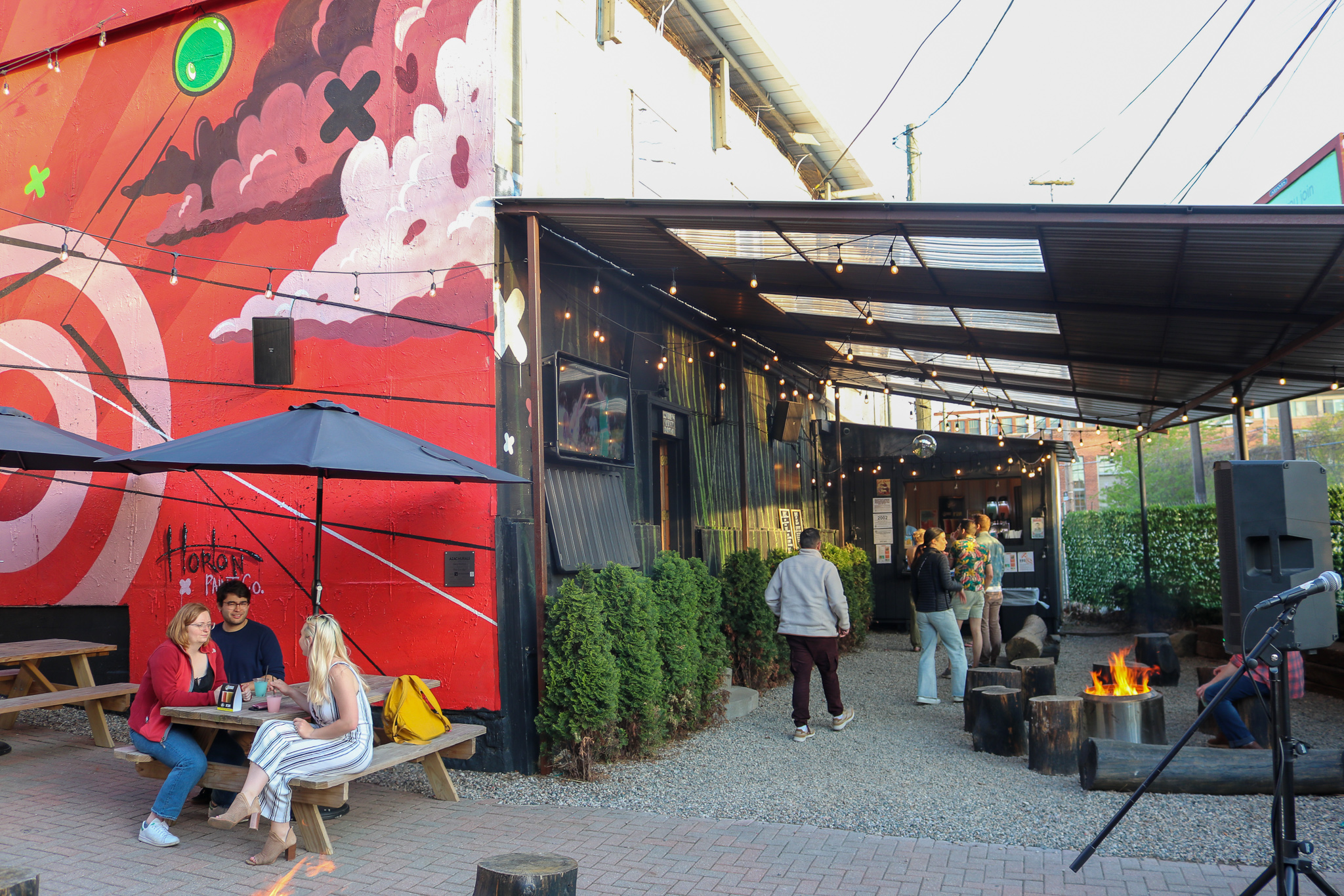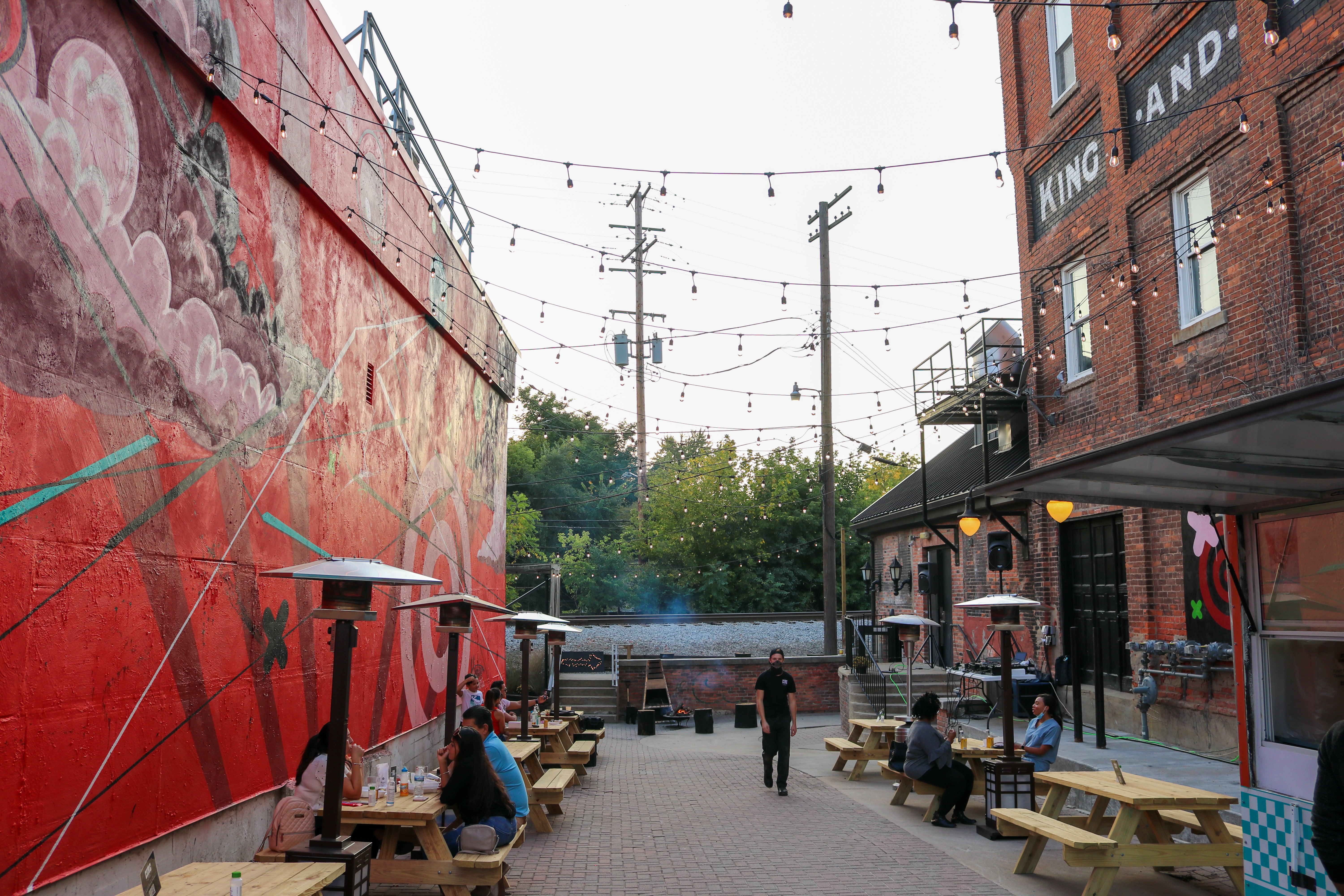 The Mural Courtyard and Railway Patio is home to Tiki, an outdoor covered bar with unique offerings such as boozy slushies, tiki-themed drinks, and our famous “boxtails.”